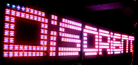 The First Sign (83 feet long x 8 feet high, 2004) was made of 1/2 in. plywood and 391 LED clusters. Each letter was sequenced individually. Wood letters fabrication, LED assembly and light sequencing were all done collaboratively by dozens of Disorienters.
